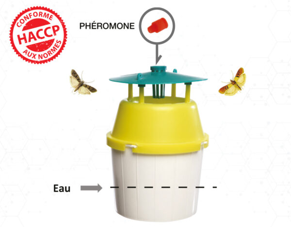 Description | LEPI FUNNEL est un dispositif dédié aux industries agro-alimentaires, entrepôts alimentaires, et magasins. Ce piège est destiné au monitoring (surveillance) et mass-trapping (piégeage de masse) des mites alimentaires adultes (papillons de types Ephestia/Plodia) dont les larves attaquent les denrées comme les grains, pain, farine… |